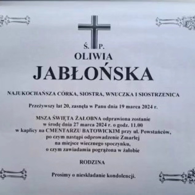 Z głębokim smutkiem i żalem przyjęliśmy wiadomość o śmierci naszej Absolwentki - Oliwii Jabłońskiej.